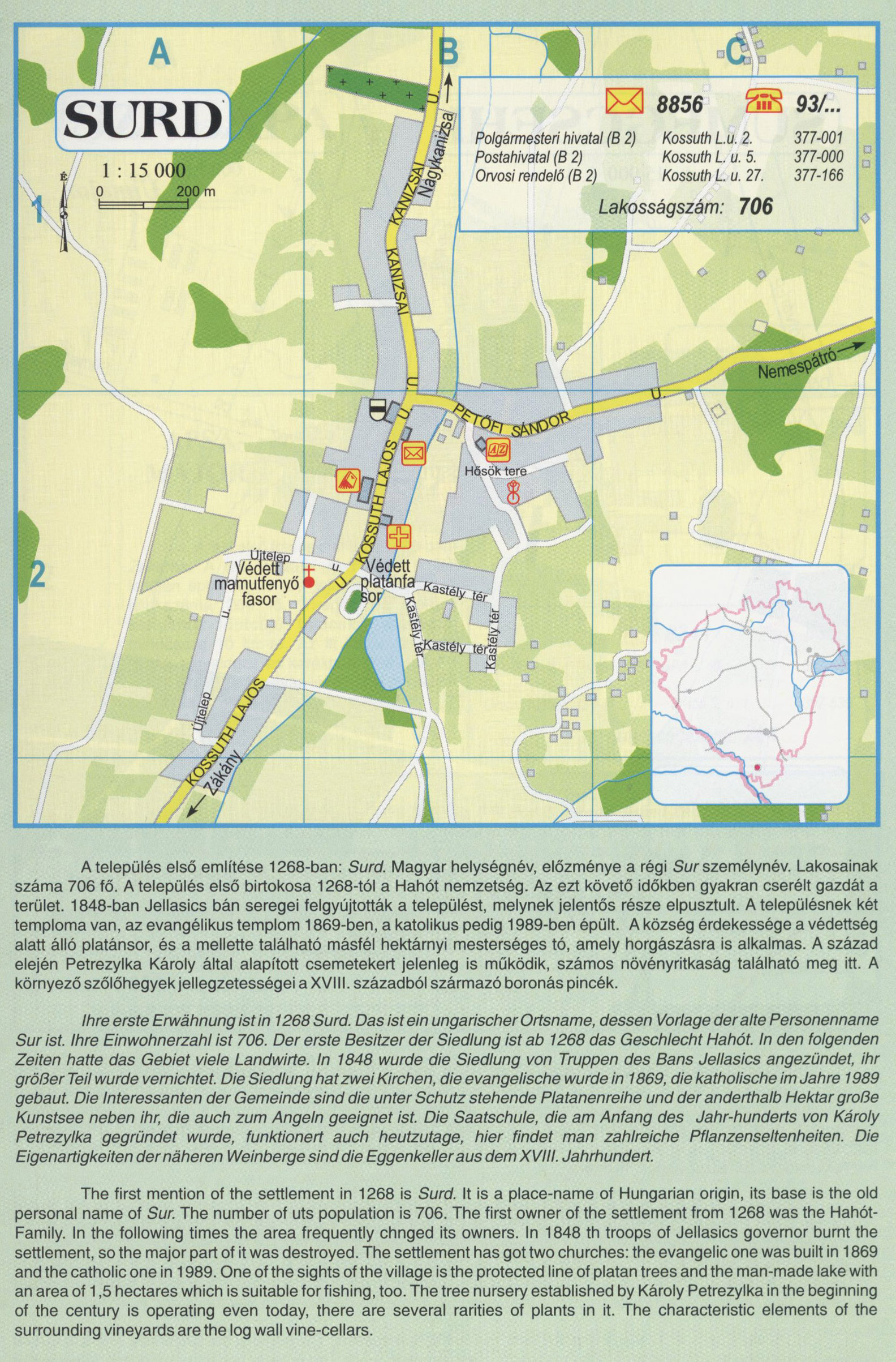 Nyilvános 3030 | 10700 | SURD | A település első említése 1268-ban: Surd. Magyar helységnév, előzménye a régi Sur személynév. Lakosainak száma 706 fő. A település első birtokosa 1268-tól a Hahót nemzetség. Az ezt követő időkben gyakran cserélt gazdát a terület. 1848-ban Jellasics bán seregei felgyújtották a települést, melynek jelentős része elpusztult. A településnek két temploma van, az evangélikus templom 1869-ben, a katolikus pedig 1989-ben épült. A község érdekessége a védettség alatt álló platánsor, és a mellette található másfél hektárnyi mesterséges tó, amely horgászásra is alkalmas. A század elején Petrezylka Károly által alapított csemetekert jelenleg is működik, számos növényritkaság található meg itt. A környező szőlőhegyek jellegzetességei a XVIII. századból származó boronás pincék. Ihre erste Erwähnung ist in 1268 Surd. Das ist ein ungarischer Ortsname, dessen Vorlage der alte Personenname Sur ist. Ihre Einwohnerzahl ist 706. Der erste Besitzer der Siedlung ist ab 1268 das Geschlecht Hahót. In den folgenden Zeiten hatte das Gebiet viele Landwirte. In 1848 wurde die Siedlung von Truppen des Bans Jellasics angezündet, ihr größer Teil wurde vernichtet. Die Siedlung hat zwei Kirchen, die evangelische wurde in 1869, die katholische im Jahre 1989 gebaut. Die Interessanten der Gemeinde sind die unter Schutz stehende Platanenreihe und der anderthalb Hektar große Kunstsee neben ihr, die auch zum Angeln geeignet ist. Die Saatschule, die am Anfang des Jahr-hunderts von Károly Petrezylka gegründet wurde, funktionert auch heutzutage, hier findet man zahlreiche Pflanzenseltenheiten. Die Eigenartigkeiten der näheren Weinberge sind die Eggenkeller aus dem XVIII. Jahrhundert. The first mention of the settlement in 1268 is Surd. It is a place-name of Hungarian origin, its base is the old personal name of Sur. The number of uts population is 706. The first owner of the settlement from 1268 was the Hahót-Family. In the following times the area frequently chnged its owners. In 1848 th troops of Jellasics governor burnt the settlement, so the major part of it was destroyed. The settlement has got two churches: the evangelic one was built in 1869 and the catholic one in 1989. One of the sights of the village is the protected line of platan trees and the man-made lake with an area of 1,5 hectares which is suitable forfishing, too. The tree nursery established by Károly Petrezylka in the beginning of the century is operating even today, there are several rarities of plants in it. The characteristic elements of the surrounding vineyards are the log wall vine-cellars. A részlet a következő kiadványból származik/Die Teile stammen vom volgenden Buch/This text came from the following book: Cím/Titel/Title: Zala megye településeinek atlasza - 257 település részletes térképe/Atlas der Komitat Zala - 257 Detailte Siedlungskarten/Zala county\'s Atlas - 257 settlement maps. Közreműködő/contributor: Lackner László (1943) (fotó) Kiadás/Ausgabe/Publisher: Gyula : HISZI-MAP, 1997 Sorozat/Serie/Series: Indulástól - megérkezésig... ETO: 912(439.121-2) ; 908.439.121 Cutter: Z 19 ISBN: 963-610-025-4 Oldalszám/Seiten/Pages: 323, 81 p. Megjegyzés/Note: Lezárva/Abgeschlossen am/Closed am: 1997. máj. 30. |