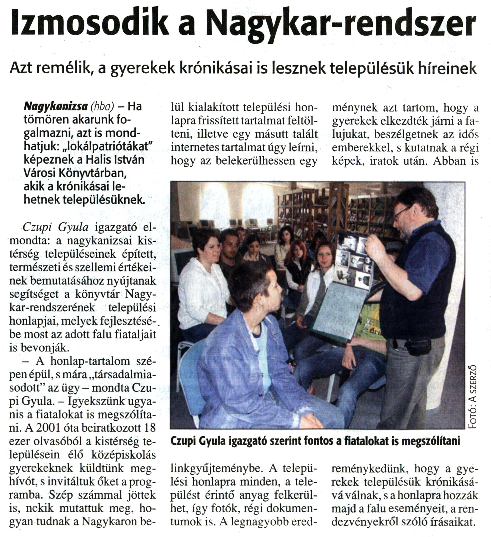 Nyilvános 14288 | 28519 | Zalai Hírlap 2008. június 9. 133. szám 12. oldal - Izmosodik a Nagykar-rendszer | A cikk szövege: Izmosodik a Nagykar-rendszer Azt remélik, a gyerekek krónikásai is lesznek településük híreinek Nagykanizsa (hba) - Ha tömören akarunk fogalmazni, azt is mondhatjuk: „lokálpatriótákat" képeznek a Halis István Városi Könyvtárban, akik a krónikásai lehetnek településüknek. Czupi Gyula igazgató elmondta: a nagykanizsai kistérség településeinek épített, természeti és szellemi értékeinek bemutatásához nyújtanak segítséget a könyvtár Nagykar-rendszerének települési honlapjai, melyek fejlesztésébe most az adott falu fiataljait is bevonják. - A honlap-tartalom szépen épül, s mára „társadalmiasodott" az ügy - mondta Czupi Gyula. - Igyekszünk ugyanis a fiatalokat is megszólítani. A 2001 óta beiratkozott 18 ezer olvasóból a kistérség településein élő középiskolás gyerekeknek küldtünk meghívót, s invitáltuk őket a programba. Szép számmal jöttek is, nekik mutattuk meg, hogyan tudnak a Nagykaron belül kialakított települési honlapra frissített tartalmat feltölteni, illetve egy másutt talált internetes tartalmat úgy leírni, hogy az belekerülhessen egy linkgyűjteménybe. A települési honlapra minden, a települést érintő anyag felkerülhet, így fotók, régi dokumentumok is. A legnagyobb eredménynek azt tartom, hogy a gyerekek elkezdték járni a falujukat, beszélgetnek az idős emberekkel, s kutatnak a régi képek, iratok után. Abban is reménykedünk, hogy a gyerekek településük krónikásává válnak, s a honlapra hozzák majd a falu eseményeit, a rendezvényekről szóló írásaikat. Képaláírás: Czupi Gyula igazgató szerint fontos a fiatalokat is megszólítani |